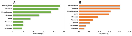 Regarding the discrimination of the phenolic profiles of plant organs (Figure 2B), there was a clear differential pattern between aerial parts and roots, as reflected by the OPLS-DA model with linearity and predictability parameters of high quality (R2Y = 0.960 and Q2Y = 0.926, respectively). Similar to the genotype-based discrimination, anthocyanins, flavonols, and phenolic acids were predicted as the most relevant subfamilies contributing to such differences, together with low-molecular-weight phenolics (LMW), which included more than 70% of total annotated compounds (Figure 3B). In this case, anthocyanins were mainly represented by malvidin and cyanidin glycosides, flavonols were represented by quercetin, kaempferol, and myricetin glycosides, phenolic acids were represented by cinnamic acids derivatives, and LMW compounds were mainly represented by catechols and coumarins (Table S4). Accordingly, these compounds are suggested to present an organ-restricted distribution in Bryophyllum.