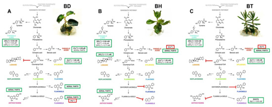 Proposed mechanism, as predicted by NFL modeling, for the biosynthesis of phenolic compounds in Bryophyllum cultured in vitro. (A) B. daigremontianum, BD; (B) B. × houghtonii, BH; (C) B. tubiflorum, BT. Green squares include the factors playing a positive role in the biosynthesis of each subfamily, whereas red squares include the factors with an inhibitory role. Bold letters indicate the most prevalent factor for each output, showing the highest contribution, according to the predictive model.