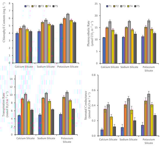 The exogeneous application of Si significantly improved the photosynthetic attributes (i.e., transpiration rate, photosynthetic rate, stomata conductance, and chlorophyll contents) in the plants of rice grownup within Cd-spiked soil (Figure 1). Maximum increases in chlorophyll contents (15.7%), photosynthetic rate (0.79%), transpiration rate (2.15), and stomatal conductance (19.51%) were observed when sodium silicate was applied at the rate of 0.50%, as compared to calcium silicate. However, potassium silicate, when applied at same concentration, improved the chlorophyll contents (31.7%), photosynthetic rate (2.05%), transpiration rate (4.50%), and stomatal conductance (34.1%), as compared to calcium silicate. However, application of potassium silicate, at the rate of 0.50%, significantly improved the photosynthetic attributes, as compared to the control.