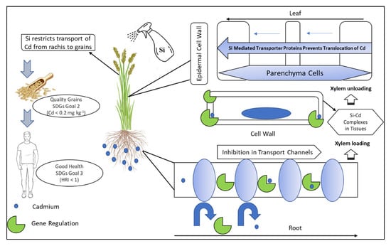 Several potential mechanisms have been proposed for the function of Si in the alleviation of Cd stress in plants: (i) Si-induced decrease in Cd accumulation, including decreased apoplastic transport of Cd, due to Si deposition in the endodermis and epidermis cell wall [37], (ii) the formation of a [Si–hemicellulose matrix] Cd complex and succeeding co-precipitation [57], (iii) down-regulation of genes involved in Cd accumulation [57], and (iv) reduce supply of Cd soil due to pH increase after application of silicate compounds for achieving the good quality grains for achieving the best health [58] as depicted in (Figure 2).