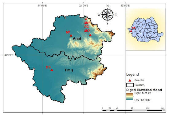 Cultivation area of the studied vine cultivars and leaf sampling locations, Arad and Timiș counties, Romania. CS—‘Cabernet Sauvignon’, MI—‘Muscat Iantarnîi’, MO—‘Muscat Ottonel’, Ch—‘Chasselas’, Vi—‘Victoria’ and MH—‘Muscat Hamburg’. The map was made by the authors using ArcGIS software [128] and their own data.