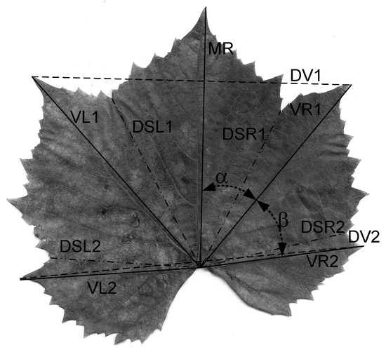 At the level of the leaf lamina, specific descriptive parameters were determined for the vine, Figure 2: Median rib—Midrib (MR); left venation of order I (VL1); right venation of order I (VR1); distance at the end of the venations VL1-VR1 (DV1); second-order left venation (VL2); second-order right venation (VR2); distance at the end of the venations VL2-VR2 (DV2); sinus base distance 1 left to lamina base (DSL1); sinus base distance 1 right to lamina base (DSR1); sinus base distance 2 left to lamina base (DSL2); sinus base distance 2 right to lamina base (DSR2); the angle α between the median rib (MR) and the right venation of the first order (VR1); the angle β between the first-order straight venation (VR1) and the second-order straight venation (VR2).