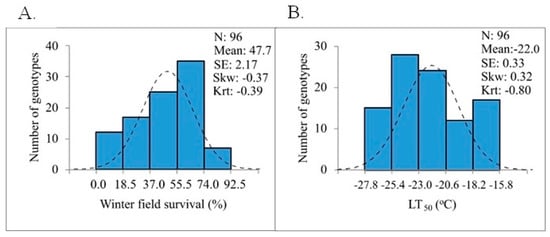 The low temperature-induced cold acclimation is a process genetically linked to vernalization [20,21]. Many cryoprotective compounds are produced during cold acclimation, which readjust metabolism, photosynthesis, and membrane composition to build up LTT prior to winter [22,23,24]. A cluster of C-REPEAT BINDING FACTOR (CBF) genes at Frost Resistance 2 (FR-2) locus on homoeologous group 5 chromosomes in Triticeae species induce many cold-responsive (COR) genes during cold acclimation [25,26,27]. Genetic factors influencing vernalization sensitivity, photoperiod (day length) response, and cold acclimation efficiency affect winter field survival (WFS) potential in cereals [28].
