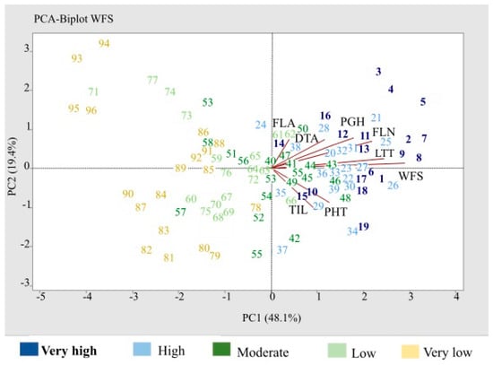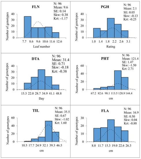 In this study, WFS in a rye population of 96 rye genotypes (Table 1) was studied during five years of field tests (Figure S1). To dissect the main trait further, we assessed traits associated with WFS, which is a strategy that can be very informative when analyzing complex traits [47]. Therefore, the WFS studies were accompanied by determinations of LTT, FLN, PGH, days to anthesis (DTA), and PHT, which associate with winter hardiness in certain winter wheat genotypes [14,35,37]. Additionally, top internode length (TIL) and flag leaf area (FLA), which are not commonly related to WFS, were also analyzed. Phenotyping of LTT and the developmental traits is relatively easy to accomplish when compared to WFS, which can vary largely from year to year due to abiotic and biotic stress factors affecting plant survival from the early seedling stage in autumn to spring regrowth.
