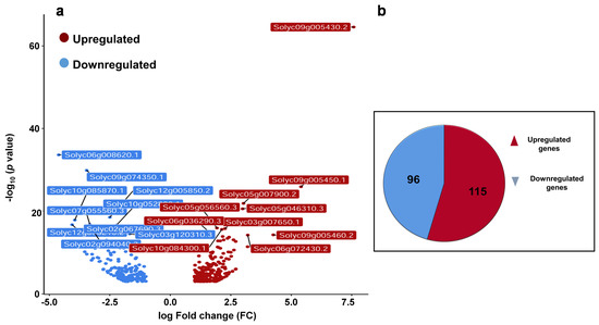Exogenous application of βCC reprograms transcriptome of tomato plants. Five-week-old tomato plants were treated with βCC or water (control) independently for 4 h, and harvested samples were subjected to RNA sequencing. The obtained transcriptome was tailored with several statistical parameters to get the most differentially expressed genes (DEGs). (a) A volcano plot was generated with the 412 DEGs to depict upregulated (red dots) and downregulated (blue dots) genes. Statistically most significant genes are marked with their gene identification (ID) numbers. (b) Further filtering of these 412 DEGs, 211 protein-coding DEGs are obtained, out of which 115 DEGs are upregulated (log2FC > 1) and 96 are downregulated (log2FC < −1).