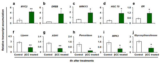 Validation of RNA sequencing results by quantitative real-time (q-RT) PCR. Relative transcript accumulations of ten candidate genes were evaluated by q-RT PCR. Similar to the RNA sequencing data, in βCC-treated plants, the relative transcript accumulations of (a) MYC2, (b) DREB3, (c) WRKY3, (d) HSC70, and (e) ER are significantly higher and transcript accumulations of (f) lipase, (g) ASH1, (h) peroxidase, (i) MPK3, and (j) glycosyltransferase are significantly lower as compared to control plants. Values are the mean ± SE of four replicate plants from each treatment. Significant differences are determined with Student’s t-test. Asterisks indicate significance at * p ≤ 0.05, ** p ≤ 0.005. Dehydration responsive element-binding 3, DREB3; Heat shock cognate 70, HSC 70; Ethylene receptor, ER; Acylsugar acylhydrolase 1, ASH1; Mitogen-activated protein kinase 3, MPK3.