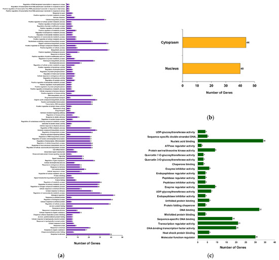 To understand the biological significance of the βCC-mediated DEGs, gene ontology (GO) analysis was performed. A total of 352 GO terms were obtained; among these, 159, 39, and 154 terms belong to the GO categories biological process (GOBP), cellular component (GOCC), and molecular function (GOMF), respectively (Supplementary Data S2). Annotation frequencies of DEGs revealed that most of the genes were annotated with the GOCC term nucleus (GO:0005634), with 43 genes having this annotation. Similarly, 25 genes were annotated with the GOMF term DNA binding (GO:0003677) and 23 genes were annotated with the GOBP term regulation of transcription, DNA-templated (GO:0006355) (Supplementary Data S2). To comprehend this large number of GO annotations, they are subjected to statistical analysis and significantly annotated terms (at FDR < 0.05) are categorized into different functional groups, where GOBP has 107 (Figure 3a), GOCC has 2 (Figure 3b), and GOMF has 24 functional groups (Figure 3c). Interestingly, the maximum number of genes were annotated with GOBP terms belonging to the group biological regulation (GO:0065007; 42 genes). Correspondingly, functional groups cytoplasm (GO:0005737; 44 genes) and nucleic acid binding (GO:0003676; 34 genes) show more genes as compared to the other functional groups (Supplementary Data S2). This suggests that βCC treatment significantly regulates a large number of genes related to the regulation of biological processes.