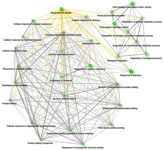 GO enrichment and interrelationship of the functional groups. GO enrichment of upregulated genes showed functional interrelationship among different functional groups. The network represents the top 30 significant functional groups at an enrichment FDR < 0.05. The network showed intricate interrelations among different functional groups including the functional group response to stress. Green nodes represent the functional groups. The size of the node is proportional to the number of genes and darkness of the nodes is proportional to the enrichment value at FDR < 0.05. Grey lines (edges) that are joining the nodes are showing functional interrelations between the nodes. The yellow edges are highlighting the interrelations of the group response to stress with other functional groups. For better visualization the positions of the nodes were rearranged.