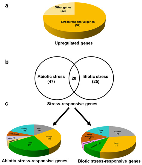 To reveal the role of 115 upregulated genes, functional predictions of the DEGs were carried. Interestingly, among 115 upregulated genes, 92 (80%) are stress-responsive (Figure 5a) and 23 genes are related to other functions. We found that, among the stress-responsive genes, 47 and 25 genes were specifically responsible for abiotic and biotic stresses, respectively. However, 20 genes have proven a role for both abiotic and biotic stresses (Figure 5b; Supplementary Data S4). A total of 92 DEGs that are responsive to abiotic and biotic stresses are involved in more than one stress; therefore, the same DEG is counted for each stress it is involved in. Abiotic stress-responsive DEGs include drought (20), heat (18), salinity (14), cold (11), oxidative (5), light (4), and hypoxia (2) (Figure 5c left panel). Similarly, DEGs responsive to biotic stresses include the attack of fungi (11), bacteria (8), herbivores (4), viruses (6), other pathogens (5), and nematode (1) (Figure 5c right panel). Among abiotic stress-responsive genes, those regulating responses to drought (20 DEGs) and heat (18 DEGs) are high in number. On the other hand, among biotic stress-responsive genes, those regulating responses to fungal (11 DEGs) and bacterial (eight DEGs) attacks are high in number (Supplementary Data S4).