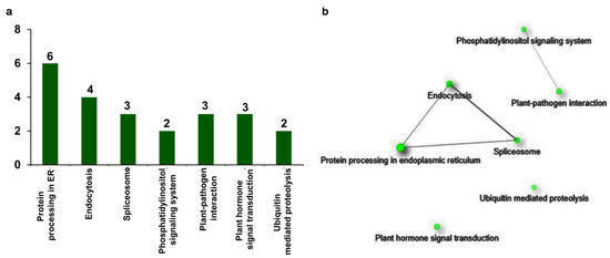 In the functional prediction and GO enrichment analysis of upregulated genes, it is evident that they encode proteins that are responsive to multiple biotic and abiotic stresses. The involvement of these proteins in specific molecular and biochemical pathways is ultimately expressed as stress-responsive phenotype. Therefore, to understand the role of upregulated genes in the regulation of different biological pathways related to stress response, they are also annotated with Kyoto Encyclopedia of Genes and Genomes (KEGG) terms. In the analysis, seven different pathways were detected for 23 genes (Figure 6a). Interestingly, the KEGG term protein processing in endoplasmic reticulum (ER) (sly04141) is the most frequently annotated to six genes, followed by the term endocytosis (sly04144) to four genes. Other KEGG terms spliceosome (sly03040), plant pathogen interaction (sly04626), and plant hormone signal transduction (sly04075) are annotated to three genes, and phosphatidylinositol signaling system (sly04070) is annotated to two genes. The last term found in the analysis is ubiquitin-mediated proteolysis (sly04120), which is annotated to two genes (Figure 6a).