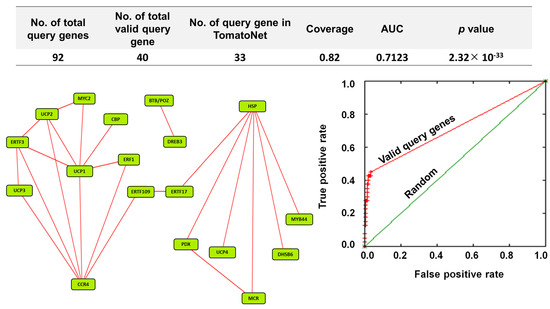 To understand the regulatory mechanism of upregulated genes in orchestrating defense response, 92 stress-responsive upregulated genes were subjected to co-functional analysis on TomatoNet [18]. It was found that out of 92 stress-responsive genes, 40 queries were valid. Out of these valid queries, 33 queries were detected in the predefined network on TomatoNet [18] (Figure 7; upper panel). A total of 18 DEGs were co-functional with the coverage of 0.82 (Figure 7; upper and left panel). The corresponding receiver operating characteristic (ROC) curve showed that the network has an area under curve (AUC) value of 0.7123 at p = 2.32 × 10−33 (Figure 7; right panel).