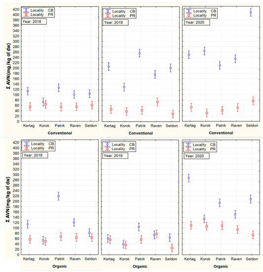 Statistical analysis of the effects of the main factors on the content of AVNs (ANOVA) and also a subsequent graph describing their mutual interactions are illustrated in Table 2 and Figure 1. The analysis confirmed a higher influence of locality and year on AVN variability compared to cultivar and the cropping system. In particular, the CB locality generally showed higher contents of Σ AVN compared to PR (158.6 mg/kg of dw vs. 60.8 mg/kg of dw). In the conventional conditions of 2019 and 2020, the increase of Σ AVNs compared to the PR locality was even 3–4 times.