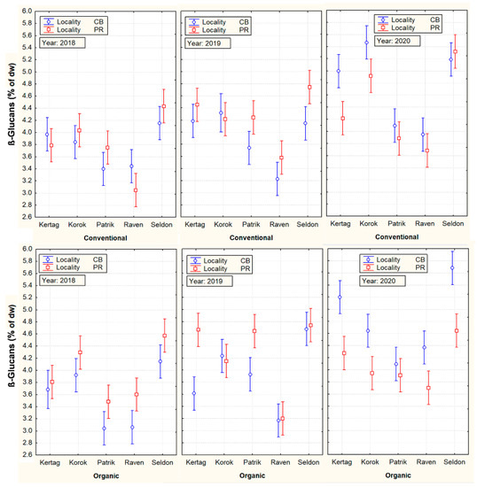 Mutual cultivar, cropping system, locality, and year interactions with ß-D-glucan content. Vertical bars denote 95% confidence intervals.