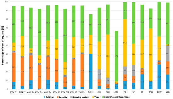 The share of the main significant factors and interactions in the total sum of squares (%) according to analysis of variance (ANOVA) model for selected grain parameters of five oat cultivars grown at two localities and different cropping systems over 3 years. Avenanthramide (AVN), total content of tested AVNs (Σ AVNs), crude protein (CP), starch (ST), fat (FT), ß-D-glucan (ß-GLU), avenin protein fraction (AVE), glutelin protein fraction (GLU), immunoreactive avenin peptides (G12), ash (ASH), thousand-grain weight (TGW), yield (YLD).
