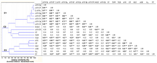 Correlation matrices with hierarchical clustering based on Pearson correlation coefficients, * significant at p ≤ 0.05; ** significant at p ≤ 0.01. Avenanthramide (AVN), total content of tested AVNs (Σ AVNs), crude protein (CP), starch (ST), fat (FT), ß-D-glucan (ß-GLU), avenin protein fraction (AVE), glutelin protein fraction (GLU), immunoreactive avenin peptides (G12), ash (ASH), thousand-grain weight (TGW), yield (YLD). Statistically significant correlation are in bold.