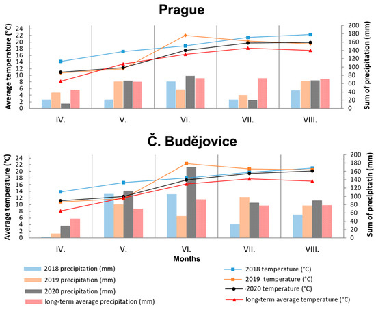 Weather vegetation conditions (April–August) at both localities in individual years (2018–2020) are shown in Figure 6. The course of mean monthly temperatures in both localities was similar and all 3 years (2018–2020) in the Czech Republic can be described as very warm compared to the long-term temperature average. However, significant differences between the two localities can be found in the monthly sum of precipitation for vegetation, which was significantly higher at the locality in CB. In particular, the sums of precipitation in May exceeded the sum of precipitation at the PR locality in all years, as well as the long-term average of the locality in the CB. The sum of temperatures during the vegetation period showed that the locality in the PR was warmer by an average of 1 °C only in 2018. In the following years, the sum of vegetation temperatures was comparable between the two localities. However, the achieved ranges of total precipitations 176 mm (2018), 251 mm (2019), and 249 mm (2020) for PR locality lagged significantly behind the CB locality with total precipitations 302 mm (2018), 320 mm (2019), and 488 mm (2020).