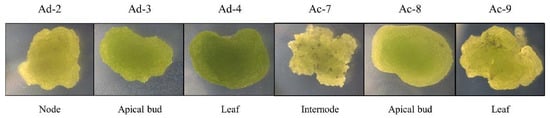 For the establishment of the cell cultures, apical buds, young stem internodes, young nodes with lateral meristem and young leaves of A. deliciosa (Ad) and A. chinensis (Ac) were explanted in solid medium A. Young internodes of both species were also explanted in medium B, differing depending on the hormonal composition (see Section 4.1).