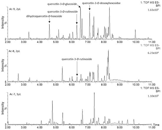 Base Peak Chromatograms (BPC) of 30-day-old calli of Ac-7, Ac-8 and Ac-9 lines, obtained by UPLC-PDA-ESI-QqTOF; these profiles were obtained from different volumes of methanol extracts (1 µL for Ac-7 and 2 µL for Ac-8 and Ac-9).
