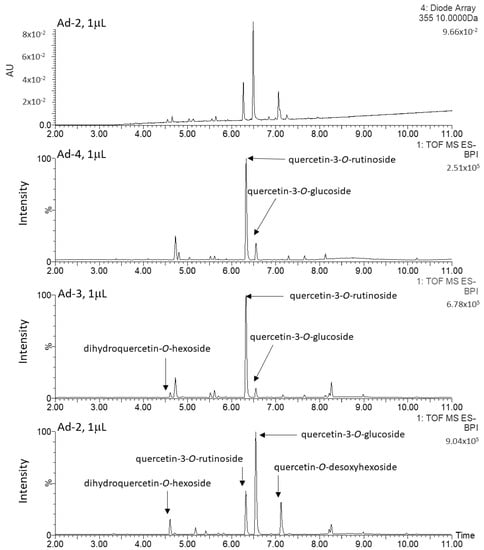 As expected, the six cell lines were able to generate fine and homogeneous suspension cultures in liquid media (data not shown). The metabolomes of their methanol extracts were then analyzed with an untargeted approach, and, quite surprisingly, the Ad-2,3,4 lines were shown to accumulate various quercetin derivatives, which ranged from 5.14 in Ad-4 to 13.26 mg/100 g fresh weight (FW) in Ad-2, corresponding to 146.38 and 419.76 mg/100 g dry weight (DW).