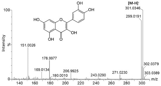 MS spectrum reporting the m/z diagnostic fragments of the quercetin aglycon.