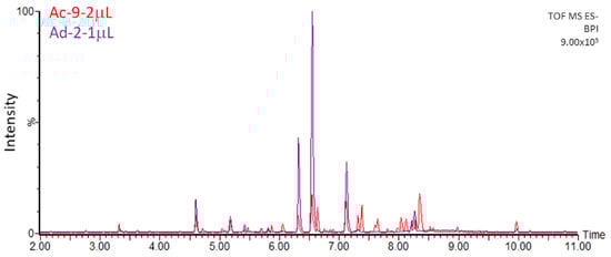 Comparison of chromatograms from 1 µL of methanol extract of Ad-2 (in violet) and 2 µL of Ac-9 (in red), using the same scale in the Y axis (intensity, expressed as percentage of the more intense peak of Ad-2).
