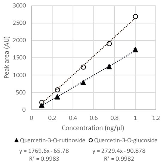 Calibration curve of quercetin-3-O-glucoside and quercetin-3-O-rutinoside; values are mean of two independent measures, +/− standard deviation. The linear regression equation and the R2 are reported.