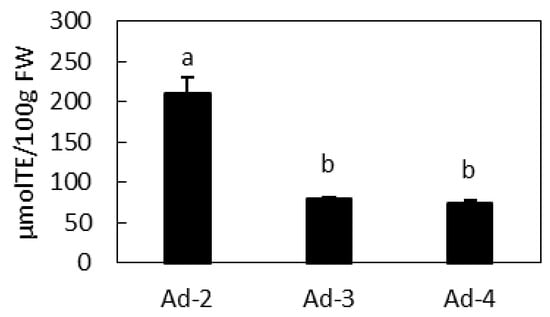 Antioxidant activity of Ad cell lines. TE, Trolox equivalents. Data are means ± standard deviations of n = 3. Different letters on bars indicate that means are significantly different according to post hoc SNK-ANOVA (p < 0.01).