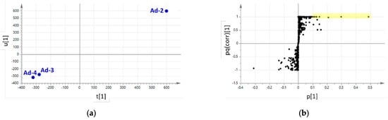 Supervised OPLS analysis of the UPLC-ESI-QqTOF data matrices for Ad cell lines to investigate the relationship between the antioxidant activity and the metabolomics profiles. (a) t[1] versus u[1] score plot; (b) p[1] versus pq(corr)[1] loading plot; metabolites are represented by black dots; yellow box highlights metabolites with p[1] > 0.1 and pq(corr)[1] > 0.97 (a list is reported in Table 3).