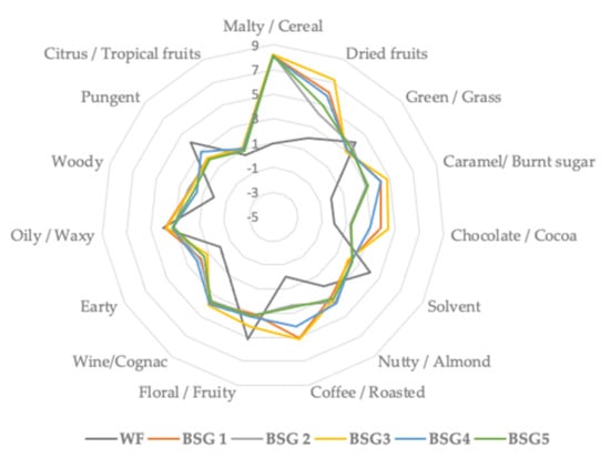 A total number of 26 aroma volatile BSG compounds were separated, identified and displayed in Table 4 and illustrated in Figure 2. For a matter of facilitation, the volatile compounds were divided in alcohols, aldehydes, ketones, terpenes and terpenoids and others. From the alcohols group, the smallest amount was identified in BSG1 (1-pentanol: 2.72%), while BSG5 registered a 1-pentanol amount of 5.36%.