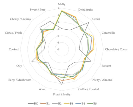 Aroma profile of control sample (BC) and samples with different BSG (brewers spent grains) types of main compounds classes identified during GC-MS analysis.