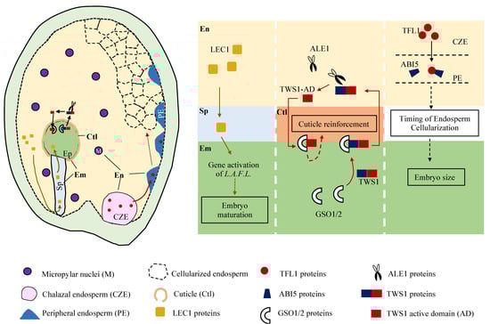 When endosperm cellularization occurs, an extracuticular sheath is deposited outside of the embryo cuticle, which is required for embryo–endosperm separation to ensure normal seed development. Sheath production depends upon the activity of an endosperm-specific bHLH transcription factor ZHOUPI (ZOU) [30,31], also known as RETARDED GROWTH OF EMBRYO1 (RGE1) [32]. Current evidence available show that ZOU controls specific signaling pathways that coordinate embryo expansion and endosperm breakdown, as well as triggering cell death by regulating the expression of cell-wall-modifying enzymes [30,33]. A recent study described a two-way communication between the endosperm and embryo, in which TWISTED SEED1 (TWS1) functions as a ligand of the receptor-like kinases GSSHO1 and GSSHO2 in the embryo and the sulfated peptide of TWS1 needs to be cleaved by the protease of the subtilase family ALE1 in the endosperm cells to release the active peptide back to the embryo, which then triggers GSSHO1/2-dependent cuticle reinforcement in the embryo [24]. Given the fact that the key enzymes TWS1 and ALE1 are separated by the cuticular sheath, this cuticle reinforcement action entails the teamwork of endosperm and embryo (Figure 2).