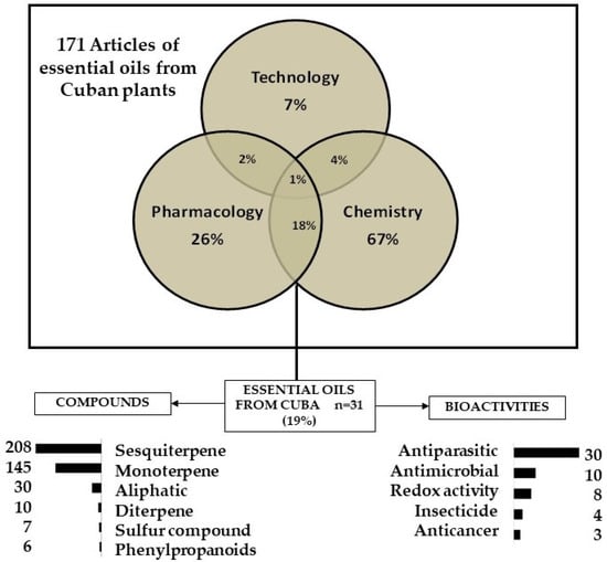 A total of 349 published articles were obtained that mention the words “essential oil” and “Cuba” (Supplementary Figure S1). After the removal of duplicates, 171 articles pertaining to EOs from Cuban plants were retrieved. In general, a higher percentage (67%) of publications focused only in EO chemical characterization, followed by a minor percent (26%) of papers that described pharmacological properties without the identification of components (Figure 1). In this regard, out of the 310,000 described plant species worldwide, 15% have been phytochemically studied and only 6% pharmacologically investigated []. Our data corroborate that the chemical diversity should maximize the possibilities of finding useful compounds for human medical needs []. In the end, we selected 31 articles, which include both chemical composition analyses and pharmacological studies. Thus, the documents used in this review represent 19% of articles reporting on EOs from Cuba. As previously pointed out, this trend emphasizes the need for drug discovery from plants to involve multidisciplinary approaches, as claimed by several authors in previous reviews [,].