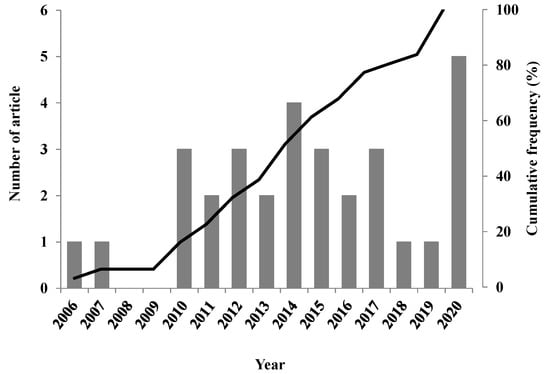 Evolution during the time of the included scientific articles (n = 31). Bars: Time course of publications showing absolute numbers; Line: Cumulative frequency.