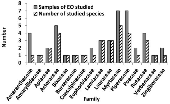As mentioned above, 31 articles that reported the chemical characterization of EOs from Cuban plants with biological activity were considered, with 33 plants and 45 samples. In general, two classic strategies were observed in the methods performed with the selected plants. In the first strategy, plants were selected based on pharmacognosy, ethnopharmacology or traditional knowledge criteria; while the second strategy was based on the use of modern pharmacology to screen and validate the use of plants as sources of drugs with extensive chemical diversity in secondary metabolites. In both cases, plant organs were collected in precise geo-localized sites, the botanical material was identified and authenticated in a recognized herbarium, and essential oil was extracted and chemically characterized, and subsequently, its biological activity was tested in different experimental biological models. In this compilation, 16 families and 33 species were included. The most representative families were Myrtaceae and Piperaceae with 7 reports, while 5 and 4 species or samples of EOs were studied, respectively (Figure 3). Asteraceae was also frequent, with 5 reports and 4 studied species. In some cases, more than one sample of the same plant was studied (Figure 3), as was the case of Dysphania ambrosioides (L.) Mosyakin & Clemants from the Amaranthaceae family (see Table 2).
