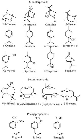In many of these EOs, the pharmacological activity has been attributed to the main identified components (Figure 4). However, only a few pure compounds were evaluated in parallel, which is very important to confirm if the potentiality of these EOs can be attributed to the presence of the main constituents, or alternatively, is due to synergistic effects with minor components. In this sense, the biological and pharmacological properties related to the main compounds identified in EOs from Cuba are also included in Table 3. As noted, only a few studies have been conducted in the reviewed documents. For example, the monoterpene citral presented a higher mortality at all development stages of Musca domestica when compared to the essential oil of C. citratus []. On the other hand, 1,8 cineole showed IC50 values of 68.3 μg/mL (0.44 mM) and 30.3 μg/mL (0.19 mM) against L. amazonensis and T. brucei, respectively, which did not correlate with it being the main compound responsible for the antiprotozoal activity of the EO from M. leucadendra []. However, the antiproliferative activity of the oil from P. amboinicus could be attributed to carvacrol, which displayed IC50 values of 6.3 and 28.8 μg/mL against Plasmodium falciparum and Leishmania amazonensis, respectively. Against human tumor cells (MCF-7, MDA-MB-231 and 22 Rv1), carvacrol also displayed good activity, with IC50 values ranging from 22.1 to 36.1 μg/mL []. In the case of the EO from T. lucida [], the observed leishmanicidal activity of the EO was also correlated with the presence of the major chemical constituent estragole, which exhibited an IC50 of 1.4 μg/mL (9.6 μM).