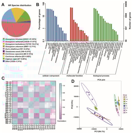 Overview of the ONT sequencing results. (A) Homogeneous analysis of the Nr species distribution; (B) GO term statistics of the annotated genes; (C) correlation between the samples; (D) principal component analysis of the samples.