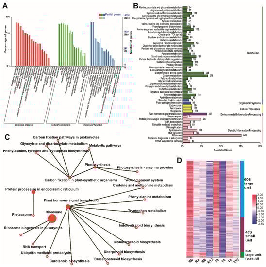 We established 14 comparison groups to screen DEGs: R0 vs. R4, R0 vs. R8, R0 vs. R12, R4 vs. R8, R8 vs. R12, T0 vs. T4, T0 vs. T8, T0 vs. T12, T4 vs. T8, T8 vs. T12, R0 vs. T0, R4 vs. T4, R8 vs. T8, and R12 vs. T12. A total of 19,600 DEGs were screened from the 14 comparison groups (Supplementary Table S5). The expression heatmap of all the DEGs indicated that they had different expression patterns in various samples (Supplementary Figure S2). These DEGs were conducted with GO term and KEGG pathway enrichment analyses. GO term enrichment analysis showed that 14,006 DEGs were annotated in the GO database. In the cellular component cluster, the largest sub-categories were membrane, cell, cell part, membrane part, and organelle, and they contained 4986 (35.60%), 6103 (43.57%), 6009 (42.90%), 4346 (31.03%), and 4562 (32.57%) genes, respectively. Binding and catalytic activity were the two most enriched GO terms in molecular function, and they accounted for 6552 (46.78%) and 6492 (46.35%) of all the GO annotated DEGs, respectively. In the biological process category, metabolic process, cellular process, and single-organism process were the top sub-categories, which accounted for 6559 (46.83%), 5978 (42.68%), and 3948 (24.97%) genes, respectively (Figure 2A). A total of 4283 DEGs were annotated in the KEGG database. The statistics of KEGG pathway enrichment of the DEGs revealed that ribosome (Ko03010), carbon metabolism (Ko01200), plant hormone signal transduction (Ko04075), biosynthesis of amino acids (Ko01230), and protein processing in endoplasmic reticulum (Ko04141) were the top enriched pathways (Figure 2B). To obtain a global picture of the connections between these KEGG pathways, we constructed a network between them and their biological adjacent pathways (Figure 2C). In the network diagram, the solid circle represents the core pathway, whereas the hollow circle represents the adjacent pathway. The size of the solid circle represents the number of enriched genes. Here, the ribosome pathway contained the largest number of DEGs, and it was correlated with RNA transport and ribosome biogenesis in eukaryotic pathways. The protein processing in endoplasmic reticulum pathway was linked to the proteasome pathway. Carbon fixation in photosynthetic organisms, photosynthesis pathways, and their adjacent pathways (e.g., metabolic pathways and photosynthesis-antenna proteins) constituted a network. The plant hormone signal transduction pathway was linked to the largest number of neighbor pathways, such as tryptophan metabolism, diterpenoid biosynthesis, and ubiquitin-mediated proteolysis.
