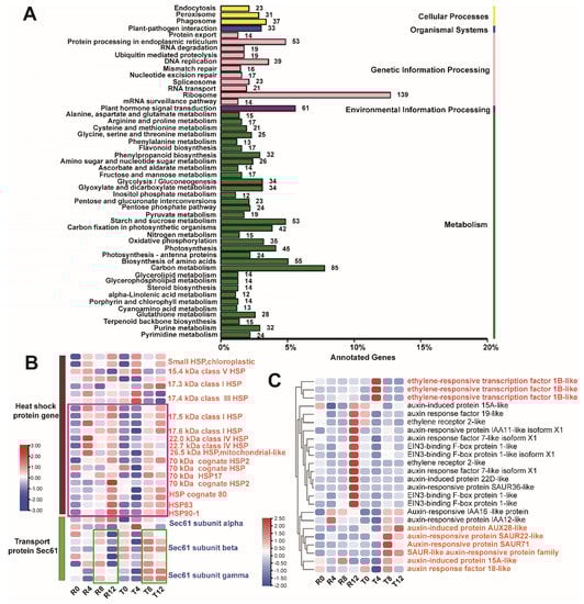 We screened 5075 DEGs from the comparison between the sensitive and tolerant type including four comparison groups (R0 vs. T0, R4 vs. T4, R8 vs. T8, and R12 vs. T12) and 1093 of them were annotated from the KEGG database. Similar to the results of KEGG pathway enrichment of the entire DEGs, these 1093 DEGs were dominantly concentrated in the ribosome, carbon metabolism, plant hormone signal transduction, and protein processing in endoplasmic reticulum pathways (Figure 3A). Considering the pathway connection between the plant hormone signal transduction and protein processing in endoplasmic reticulum and their neighbor pathways, as described in Figure 2C, we further analyzed the DEGs enriched in these two pathways. Among the 53 DEGs involved in the protein processing in the endoplasmic reticulum pathway, 22 of them were annotated as HSP, and nine of them were annotated as transport protein Sec61 (Sec61). The 22 DEGs were annotated into 17 HSP members, such as 17.5 KDa class I. HSP (HSP17.5) and 70 KDa HSP (HSP70). Expression analysis showed that 12 HSPs (e.g., HSP17.5, HSP70-17, and HSP83) exhibited a similar expression pattern, which enhanced expression levels in R4, R8, and R12 compared with R0, but insignificantly changed in T4 and remarkably increased in T8 and T12 when compared with T0 (Figure 3B). These results reflect the difference between the sensitive and tolerant types in the response of HSP to high-temperature. Additionally, the expression of Sec61 subunit beta and gamma showed differences between the two cultivars; the expression levels were enhanced in T8 and T12 but decreased in R12 (Figure 3B).