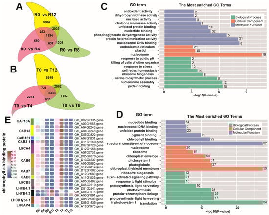 Analysis of the DEGs from the intra-groups of the two cotton cultivars. (A) Venn diagram showing the DEG numbers in each comparison group of the sensitive cultivar; (B) Venn diagram showed the DEG numbers in each comparison group of the tolerant cultivar; (C) the top 20 GO terms of the overlap DEGs in the sensitive cultivar; (D) the top 20 GO terms of the overlap DEGs in the tolerant cultivar; (E) expression profile of the chlorophyll a-b binding protein genes.