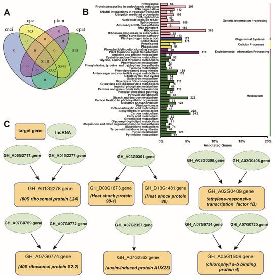 The present study also predicted the target genes of the predicted lncRNAs, and a total of 24,462 target genes were obtained. Among them, a total of 17,087 and 4337 were annotated from the GO and KEGG databases, respectively. GO term statistics of the target genes showed that metabolic process, cellular process, membrane, cell, binding, and catalytic activity were the most enriched (Supplementary Figure S4C). KEGG pathway enrichment analysis of the target genes showed that the dominant pathways were ribosome, plant hormone signaling transduction, carbon metabolism, and protein processing in endoplasmic reticulum (Figure 5B). These results were consistent with the results of DEG analysis. We screened several representative target genes and their corresponding lncRNAs to show their relationship. As shown in Figure 5C, seven genes were the target genes of lncRNAs; for example, 60S ribosomal protein L24 was the target gene of lncRNAs GH_A05G2717.gene and GH_A01G2277.gene, whereas HSP90-1 and HSP80 were the targets of the lncRNA GH_A03G0301.gene. These target genes were the representatives of the enriched KEGG pathways.