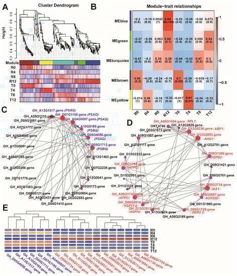 Gene co-expression analysis. (A) The cluster dendrogram of all the samples; (B) module-trait relationships of the samples; (C) network between the genes from the MEyellow module in T4; (D) network between the genes from the MEblue module in R12. (E) expression profile of the key hub genes.