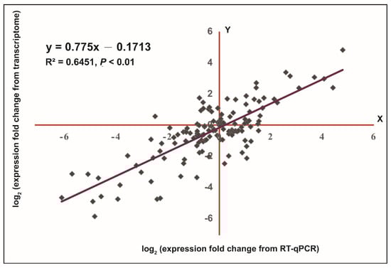 Twenty genes were randomly selected for correlation analysis between the ONT transcriptome data and RT-qPCR results to confirm reliability of the transcriptome data. As shown in Figure 7, the data from the ONT transcriptome and RT-qPCR were significantly correlated with R2 = 0.6451 (p < 0.01), indicating that the ONT transcriptome data were credible in this study.