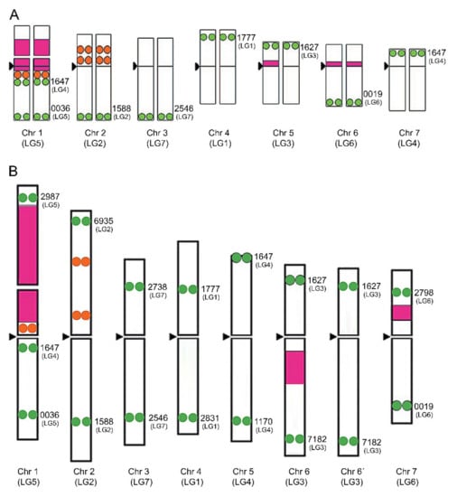 Cytogenetic map of T. pratense based on the hybridization pattern of probes derived from 5S rDNA (orange circles) and 26S rDNA (pink boxes) and localization of 7 (A) or 14 (B) BAC clones corresponding to chromosome-specific microsatellite markers (green circles) (adapted from Sato et al. [43] and Kataoka et al. [68].