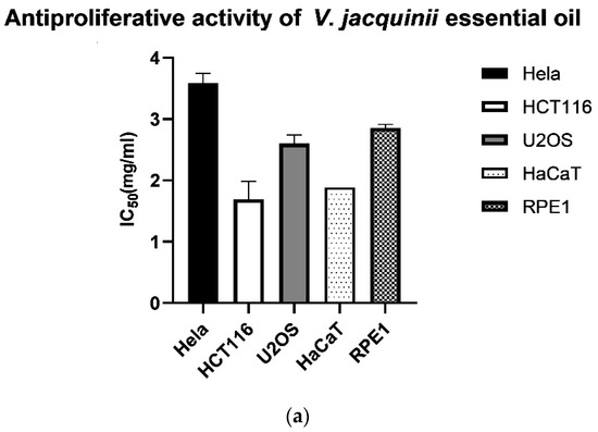 The antiproliferative capacity of the EO of V. austriaca ssp. jacquinii was determined on HeLa, HCT116 and U2OS cancer cells and in healthy cells HaCaT and RPE1 using the MTS-based CellTiter 96® Aqueous Assay (Promega, Madison, WI, USA). Cells were grown in an incubator at 37 °C and 5% CO2 until they reached 80% confluence. They were counted using a handheld automated cell counter (Scepter, Merck), and 5000 cells/well were seeded in 96-well plates with a serial dilution of the EOs and hydrosols. The cells were then cultured for an additional 48 h. Thereafter, 20 μL MTS tetrazolium reagent (Promega, Madison, WI, USA) was added to each well and left in the incubator for a further 3 h. Then, absorbance was measured at 490 nm using a microplate reader (Bio-Tek, EL808). IC50 values were calculated from three independent experiments using GraFit 6 data analysis software (Erithacus, East Grinstead, UK).