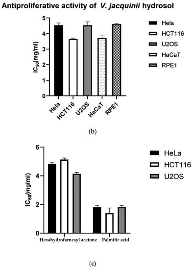 Antiproliferative activity of: (a) V. austriaca ssp. jacquinii EO; (b) V. austriaca ssp. jacquinii hydrosol; (c) Standards of the most abundant compounds.