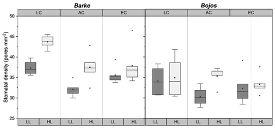 High light intensity is known to increase stomatal density [31,32]. The molecular background for the increase in stomatal density under HL conditions has been identified as signaling peptide known as STOMAGEN or EPFL9, which encodes an epidermal patterning factor that positively influences stomatal density and index on both sides of the leaf [33,34]. A previous study on the effect of light on stomatal density in barley showed no significant difference between leaves grown in LL versus HL environments [30], however that study used significantly lower levels of light intensity even for HL environment (200 µmol m−2s−1), which is half of the intensity of our LL conditions. Our high light treatment conditions coincided with the average light saturation point for barley (1500 µmol m−2s−1) [35] and shows a strong positive effect on stomatal density (Table 1, Figure 1). This suggests that light can increase the stomatal density at high intensities, however, perhaps stomatal density will not be decreased by progressively dimmer light below a certain point.