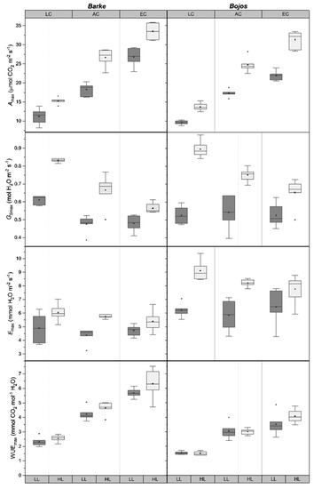 Boxplots showing differences gas exchange parameters for barley genotypes Barke (left) and Bojos (right). LC = low [CO2], AC = ambient [CO2], EC = elevated [CO2]; LL = low light (dark grey boxes), HL = high light (light grey boxes). Medians (central line), means (black squares), 25 and 75 percentiles (boxes), 1.5 interquartile range (error bars) and outliers (stars) are presented (n = 6).