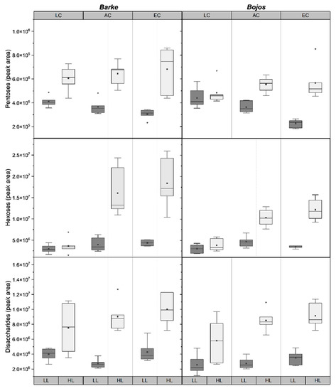 Accumulation of sugars—pentoses, hexoses, and disaccharides—were all found to be significantly (p < 0.001) influenced by light conditions (Table 1). All HL plants had a greater accumulation of all sugars compared to LL plants, except for hexoses in LC, which did not show a difference between HL and LL (Figure 3). Genotype significantly influenced pentose (p = 0.005) and hexose (p = 0.003) levels, with Barke having higher levels of accumulation of both, and a greater increase at HL compared to Bojos (Figure 3). Hexose levels peaked for AC-HL and EC-HL plants for both genotypes (Figure 3). [CO2] significantly influenced hexose (p < 0.001) and disaccharides (p = 0.007) (Table 1). Disaccharides show an increasing trend alongside increasing [CO2] in HL but were relatively stable across [CO2] treatments in LL (Figure 3). Pentose was significantly influenced by a combination of genotype and light (p = 0.041) and [CO2] and light (p < 0.001): In both Barke and Bojos, levels of pentoses showed a slightly increasing trend with increasing [CO2] under HL, but a decreasing trend with increasing [CO2] under LL. The increase of pentoses under HL was more prominent for Barke, while the low light decrease was more prominent for Bojos (Figure 3).