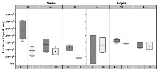 Boxplots showing differences in peak area abscisic acid measured in barley genotypes, Barke (left) and Bojos (right). LC = low [CO2], AC = ambient [CO2], EC = elevated [CO2]; LL = low light (dark grey boxes), HL = high light (light grey boxes). Medians (central line), means (black squares), 25 and 75 percentiles (boxes), 1.5 interquartile range (error bars), and outliers (stars) are presented (n = 6).