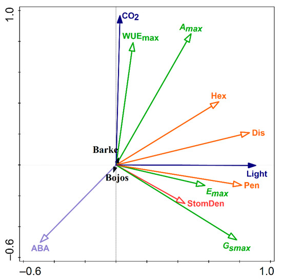 Biplot diagram representing the results of redundancy analysis (RDA) on the effects of light intensity (Light), CO2 concentration (CO2), and genotype (Barke and Bojos) on stomatal density (StomDen), accumulation of pentose (Pen), disaccharides (Dis), hexose (Hex), and abscisic acid (ABA), and parameters of stomatal function: Photosynthesis (Amax), Transpiration (Emax), stomatal conductance (GSmax), and water use efficiency (WUEmax).